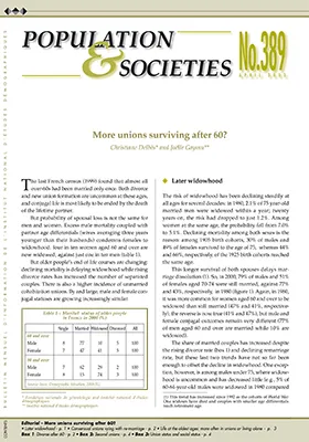 The last French census (1999) found that almost all over-60s had been married only once. Both divorce and new union formation are uncommon at these ages, and conjugal life is most likely to be ended by the death of the lifetime partner. But probability of spousal loss is not the same for men and women. Excess male mortality coupled with partner age differentials (wives averaging three years younger than their husbands) condemns females to widowhood: four in ten women aged 60 and over are now widowed, against just one in ten men (table 1). But older people’s end of life courses are changing: declining mortality is delaying widowhood while rising divorce rates has increased the number of separated couples. There is also a higher incidence of unmarried cohabitation unions. By and large, male and female conjugal statuses are growing increasingly similar.