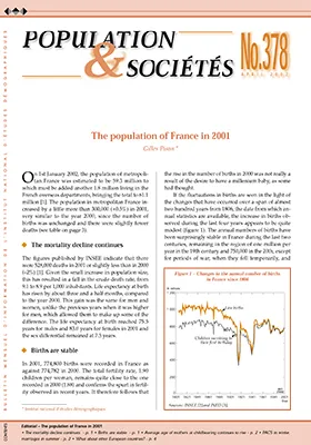 On 1st January 2002, the population of metropolitan France was estimated to be 59.3 million to which must be added another 1.8 million living in the French overseas departments, bringing the total to 61.1 million [1]. The population in metropolitan France increased by a little more than 300,000 (+0.5%) in 2001, very similar to the year 2000, since the number of births was unchanged and there were slightly fewer deaths (see table on page 3).