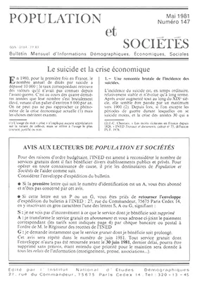 En 1980, pour la première fois en France, le nombre annuel de décès par suicide a dépassé 10 000 ; le taux correspondant retrouve des valeurs qu'il n(avait pas connues depuis l'avant-guerre.