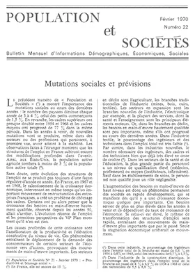 Le précédent uméro a montré l'importance des mutations sociales au cours des dernières années : le nombre des paysans diminue chaque année de 3 à 4 %, celui des commerçants de 1,5%. En revanche, les cadres supérieurs ont presque doublé entre 1954 et 1968 et les cadres moyens ont progressé de 77%.