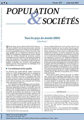 Tous les deux ans, le numéro d'été de Population et Sociétés, intitulé « Tous les pays du monde », présente un tableau de la population mondiale. Les données proviennent essentiellement de la World Population Data Sheet publiée par le Population Reference Bureau (PRB) [1]. Cet organisme indépendant synthétise chaque année les chiffres émanant de plusieurs sources, essentiellement la Division de la Population des Nations unies [2], le Bureau of the Census des États-Unis, le Conseil de l'Europe et... l'Ined [3], qui s'efforcent de rassembler l'ensemble des données démographiques publiées par les offices nationaux de statistique et les organisations internationales.